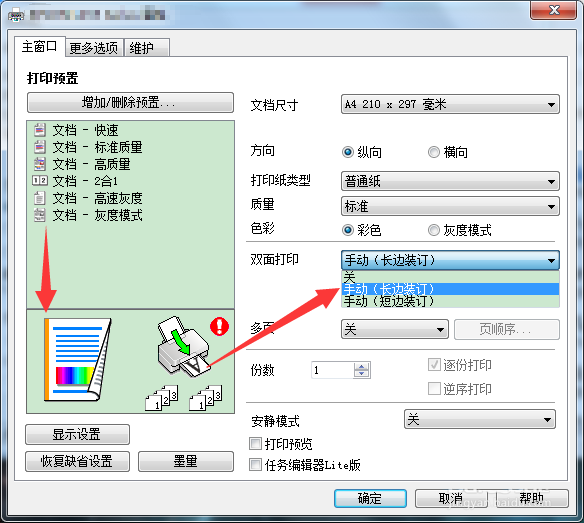 3、進入屬性,選擇打印紙張大小(以A4為例),雙面打印默認為關閉狀態(tài),其中選擇手動長邊裝訂和手動短邊裝訂,并點擊確定。