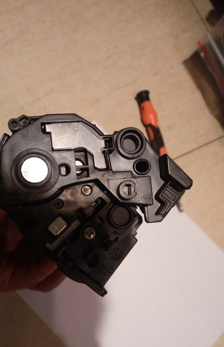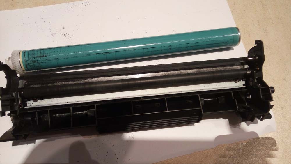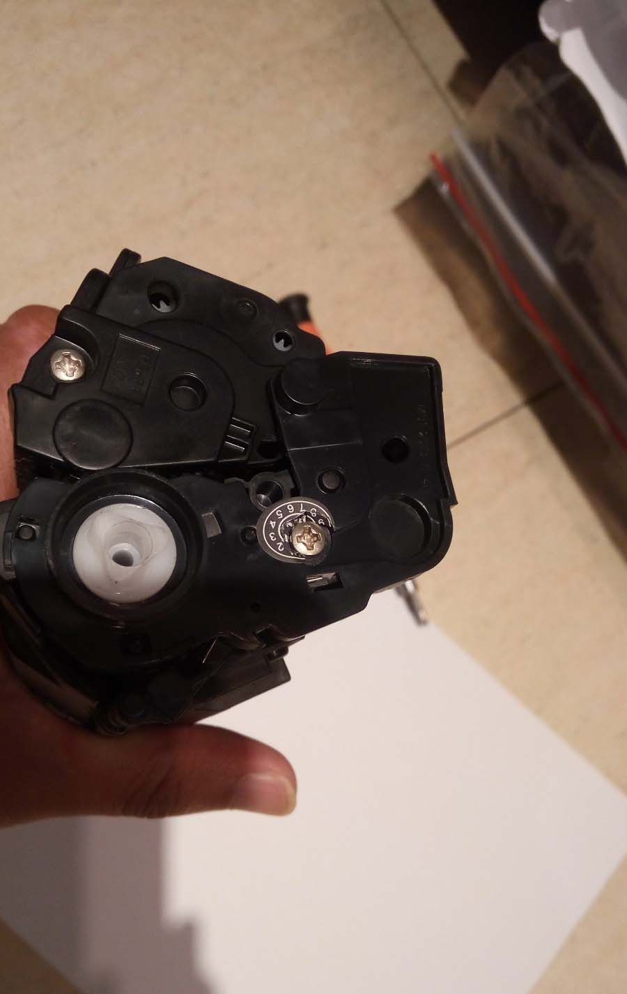 惠普P1007打印機打印出現黑色條痕,或者拿硒鼓出來打開硒鼓擋板看到硒鼓(綠色的那根)上面有黑色的條痕痕跡就說明廢粉倉滿了,需要清理廢粉倉,一般現在國產的硒鼓都有方便倒粉和方便清理廢粉的口子直接倒出,但往往不如人意,最好還是拆開做一遍完整的清理,下面我們就來看看看看打印機廢粉收集器清零的圖文介紹。