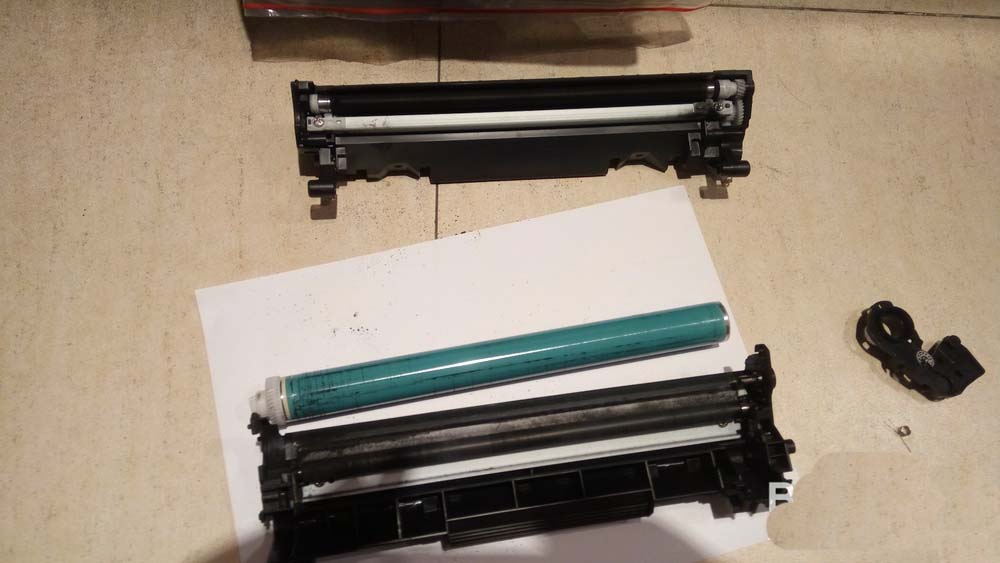 5、取出后我們看到綠色硒鼓和清理棍上面都有黑色的條痕,再仔細看清理棍上面白色擋板的上面廢粉已經滿出來了,這就是造成打印有黑色條痕的原因