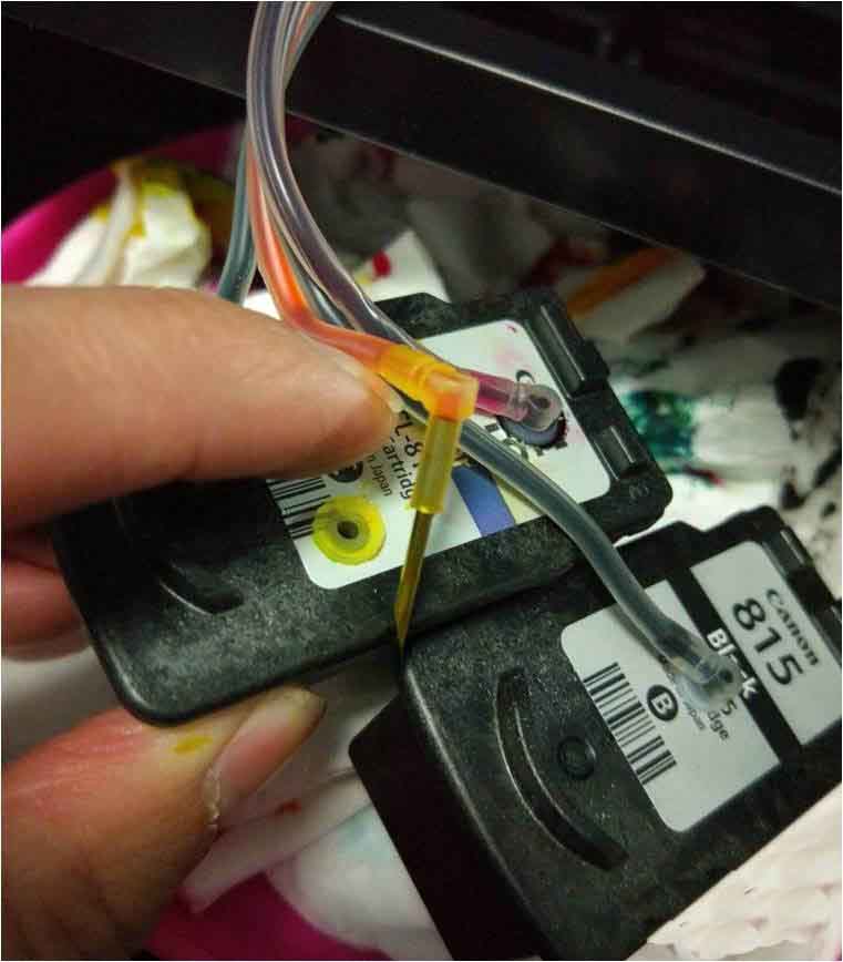 6、完成上面步驟后,把進(jìn)口針還插入進(jìn)墨口。打開連供的墨水開關(guān)。