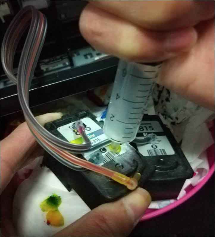 注意:筆者沒用酒精,就用氣壓往里吹氣,墨盒中原有的黃色墨水有少許流出,應(yīng)該是用酒精效果更好,可以溶解堵塞的出墨口。
