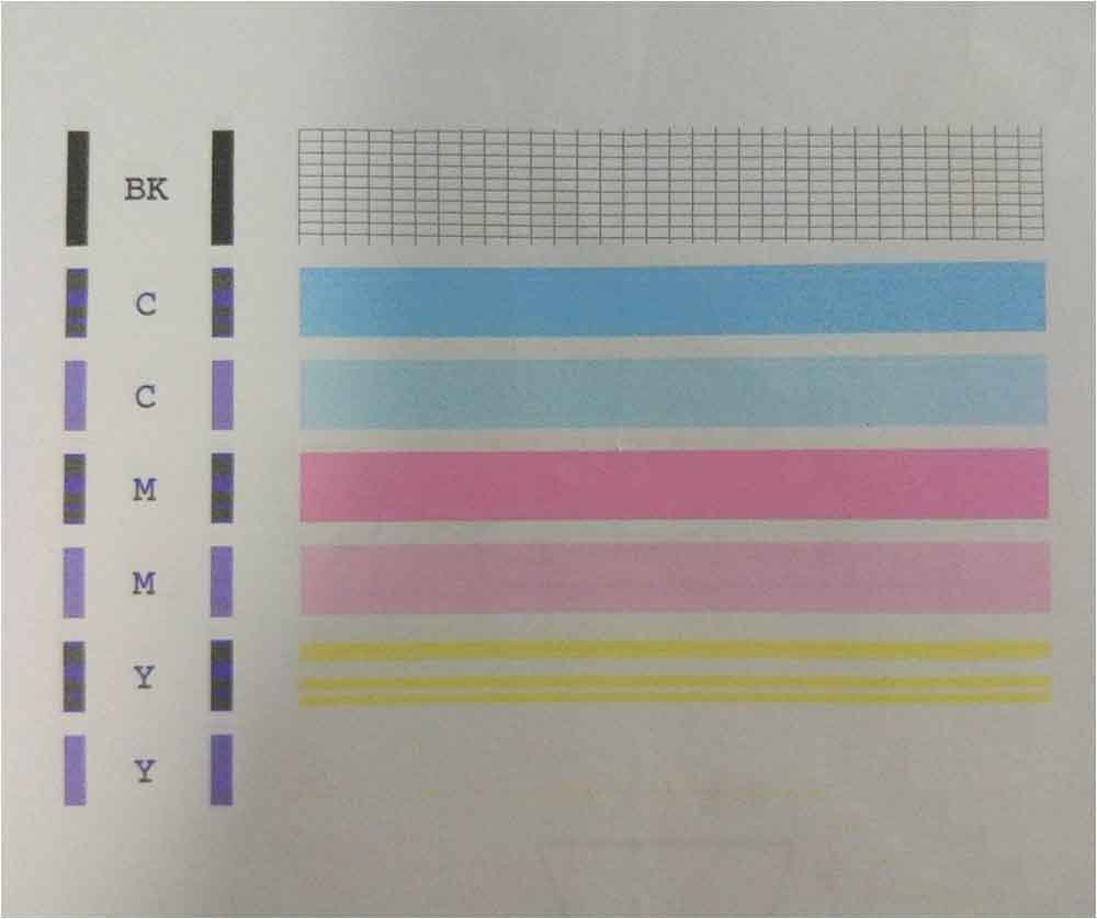 8、重新通過噴嘴檢查打印顏色圖案,發(fā)現(xiàn)黃色出來了點(diǎn)。(一開始是一點(diǎn)黃色的也沒有的)如果用酒精清洗或多清洗幾次效果可能更好。