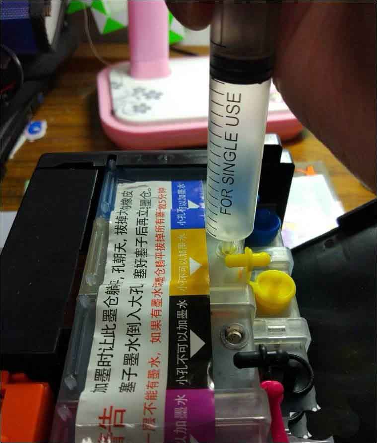 7、把墨盒倒下來,通過小孔往里打氣,把墨水壓進(jìn)墨盒。