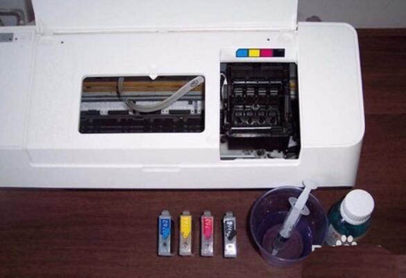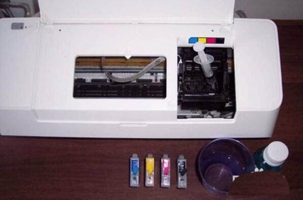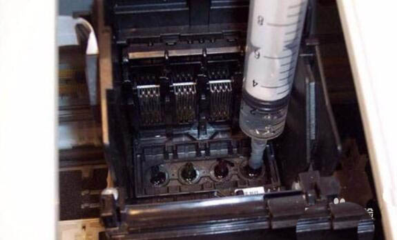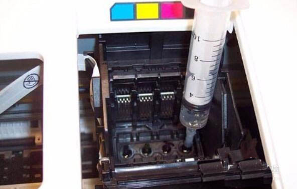 用針筒抽取2ML左右清通液,(6色打印機相應使用量為3ML),在黑色墨柱里慢慢加入0.3至0.4毫升,彩色每個進墨柱里加入0.2至0.3毫升,針筒內余下的0.5至1.0ML全注入在洗車槽內,然后裝回墨盒,馬上將墨車移到停車位(即洗車槽上,打印機關機時墨車的那個位置)