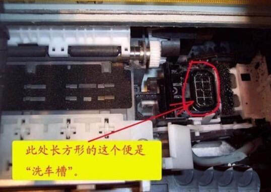 8、噴嘴內部用含清水的針筒抽過后,順便,將洗車槽也清洗一下,(墨車向左推過去一點,就能看清楚洗車槽了),如下圖: