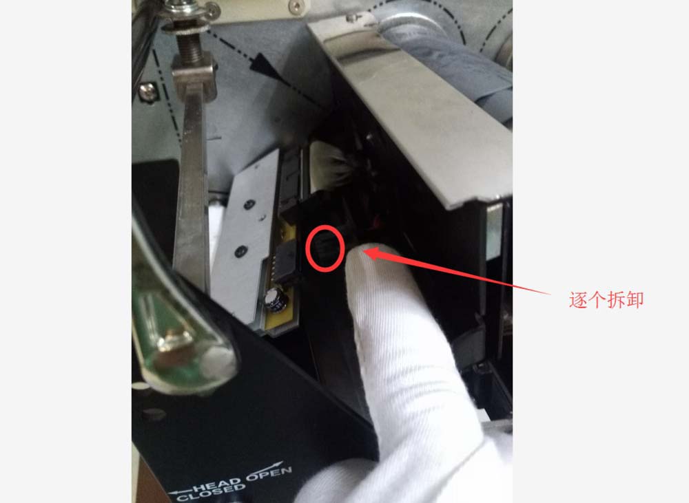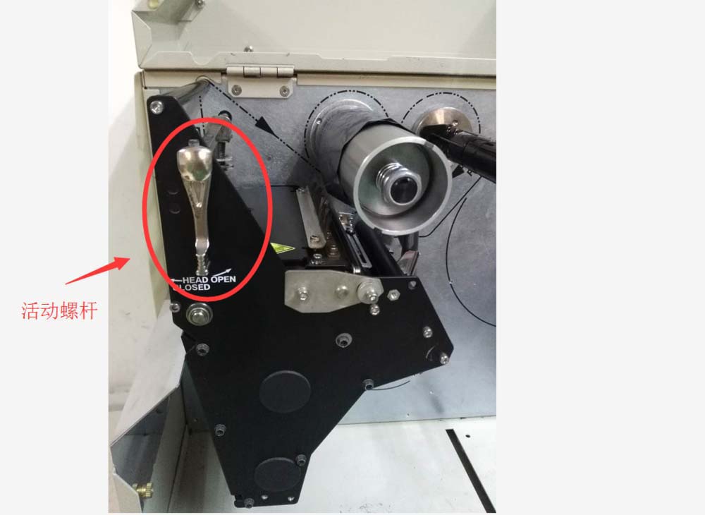 3、一字固定螺絲松開后,轉動活動螺桿將壓住擋板的小鐵柱釋放開,便于我們取里面的打印頭。
