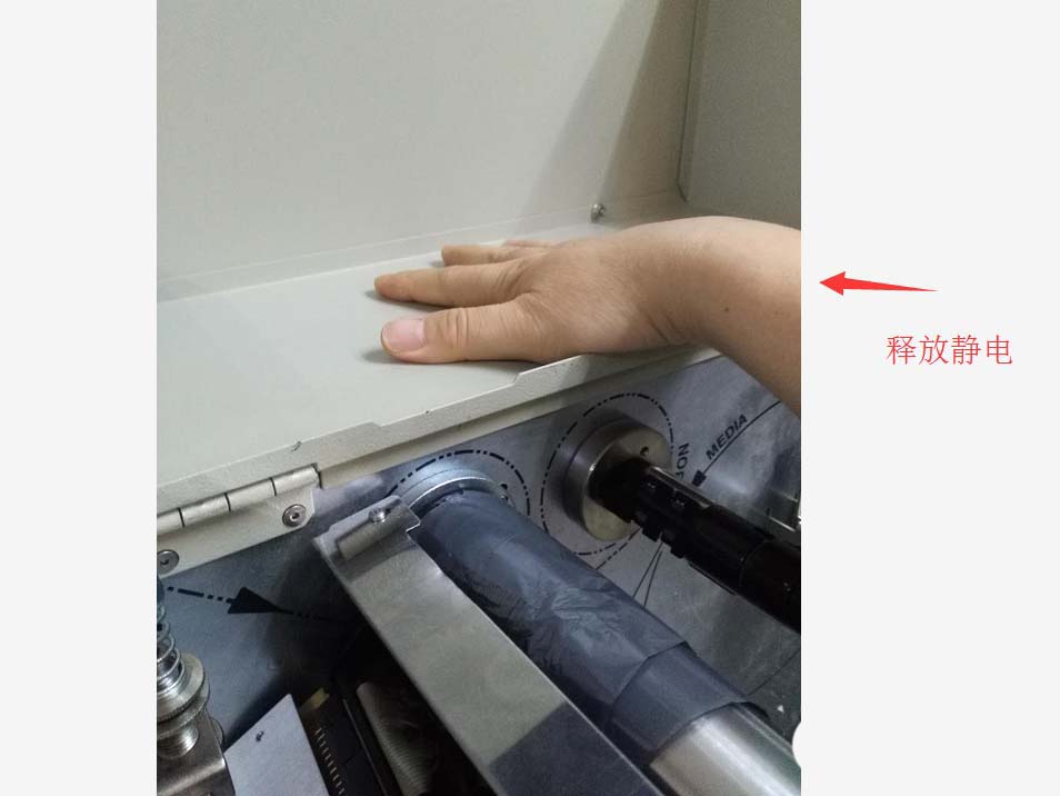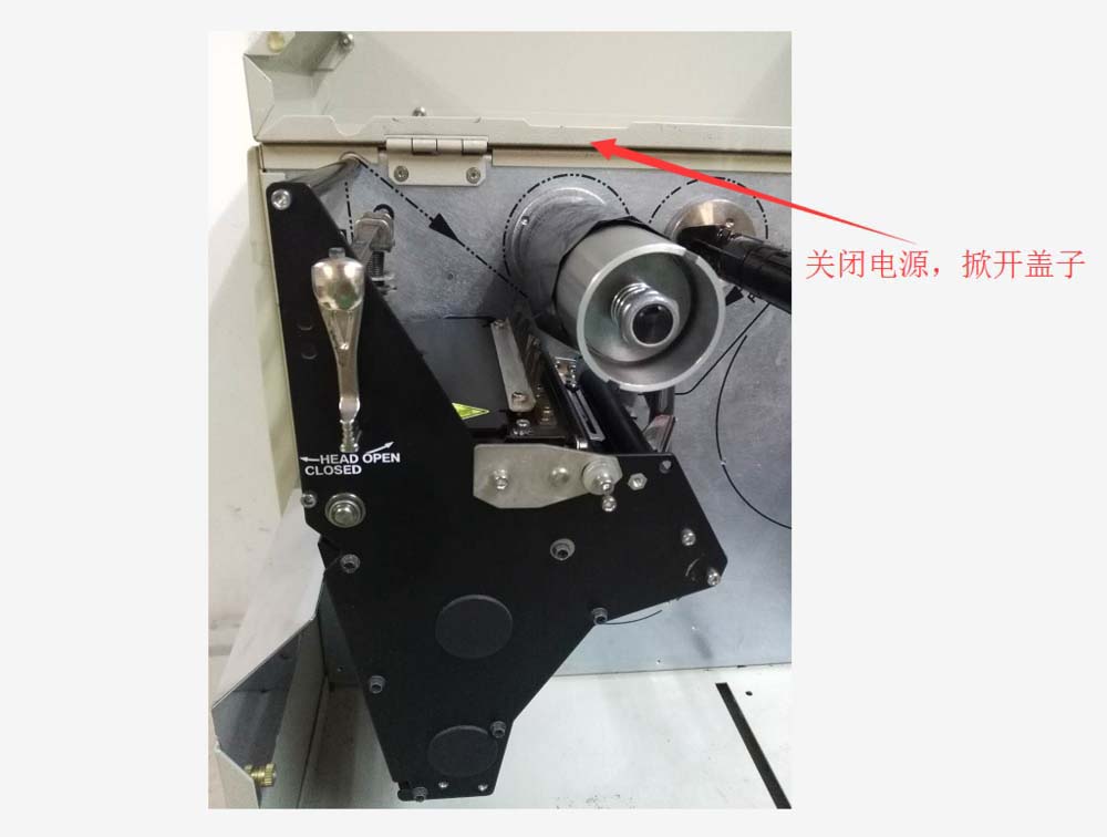 1、關閉打印機電源開關,這個是首先要做的,即便是更換碳帶或條碼紙都需要關閉電源后操作。在從側面(可掀開)開啟打印機蓋子。
