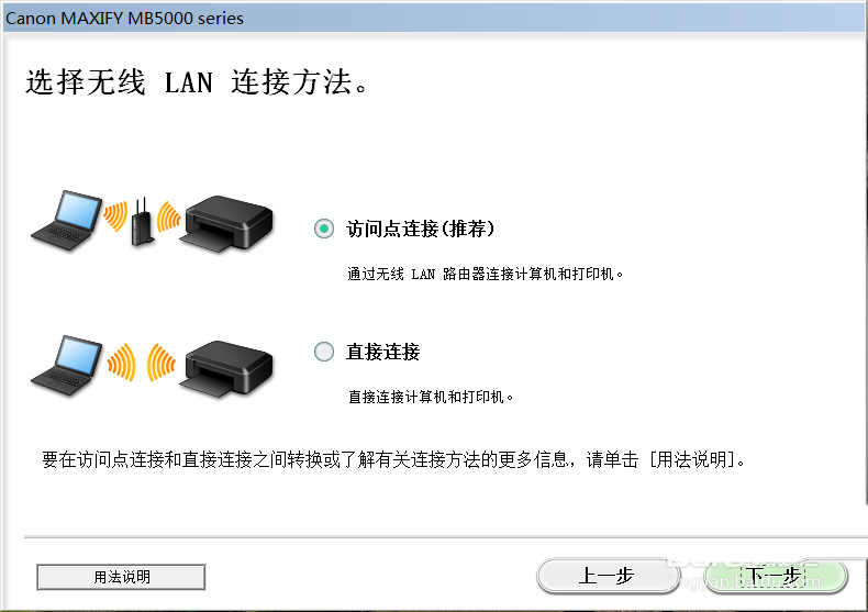5、選擇無線連接方式后,點擊下一步,在這一步我們可以看到兩個連接方法,一個是訪問點連接,一個是直接連接,我們就選擇推薦的這個吧,如下圖所示。