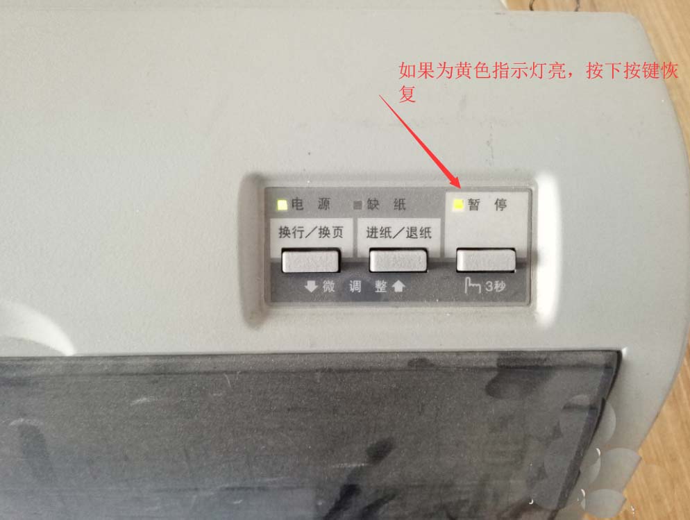 2、在右側(cè)功能區(qū)如果暫停指示燈為黃色,那么按下暫停按鈕恢復(fù)正常即可成功放置紙張或發(fā)票。