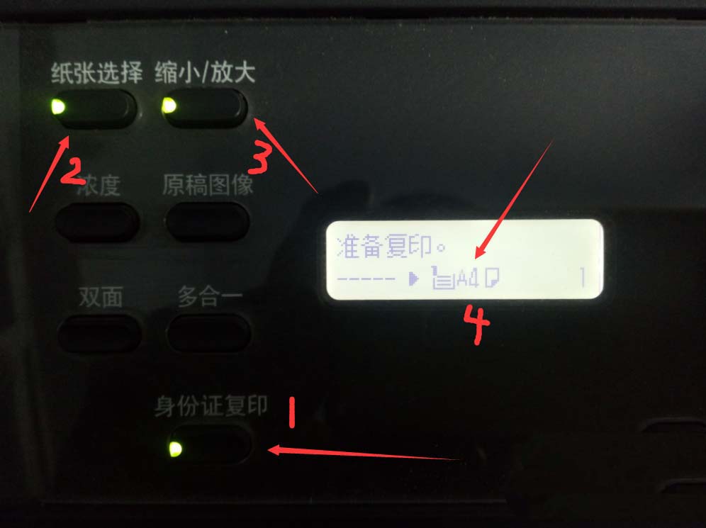 2、開啟成功后,身份證復印、紙張選擇和縮小/放大指示燈亮,然后我們裝入A4紙張,必須為A4紙。