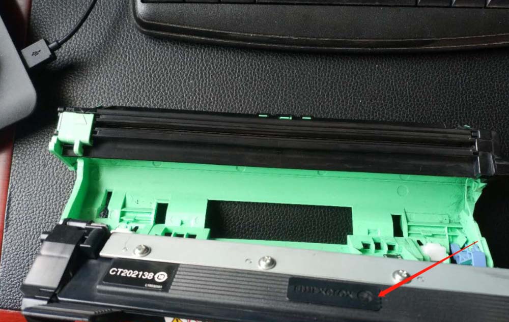 7、整體裝好后,將整個裝入打印機中,鼓架上有一大一小吐出來的滑竿,小的在前,大的在后,對準打印機的凹槽,往下面放,按倒聽到卡扣聲就說明安裝到位。