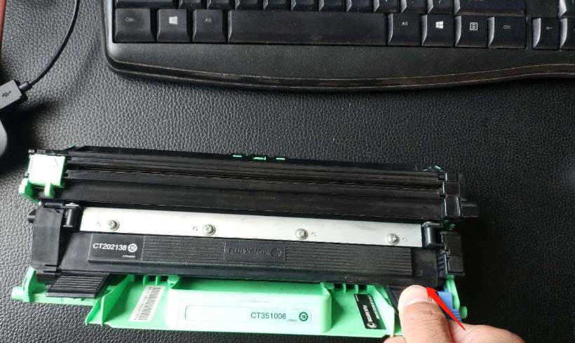 4、取出后,按住鼓架,右側的一個藍色扣子,往下按,墨盒就可以彈開。