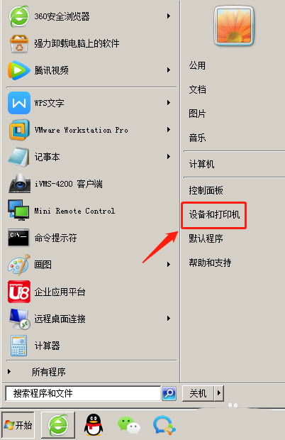 1、首先打開系統(tǒng)的開始菜單,然后再選擇“設(shè)備和打印機(jī)”