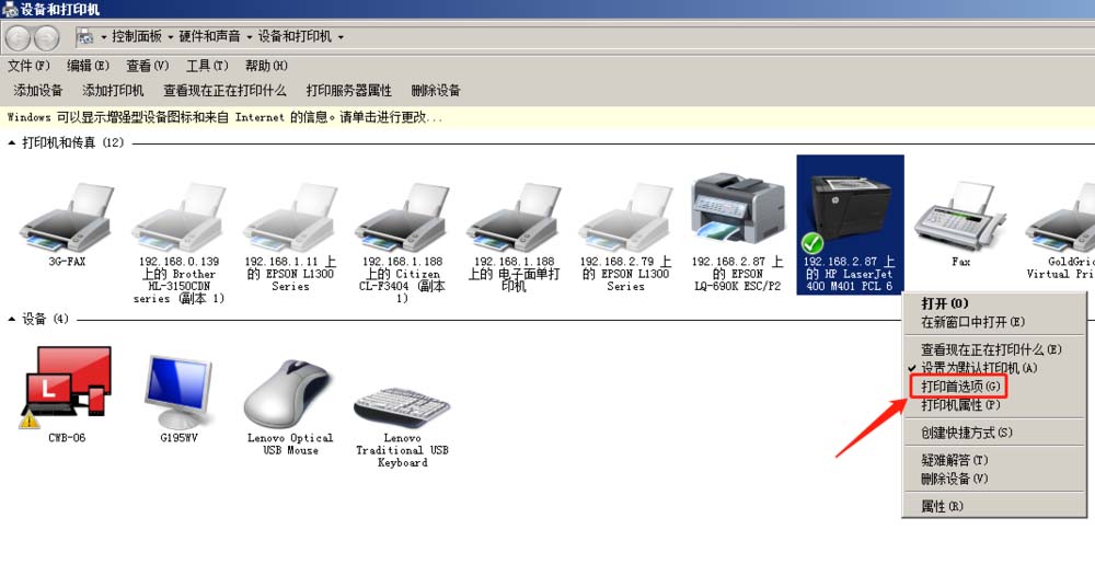 2、然后在設(shè)備和打印機(jī)列表里面找到打印機(jī),對著打印機(jī)圖標(biāo)單擊右鍵彈出菜單,在彈出菜單里面我們選擇“打印首選項”