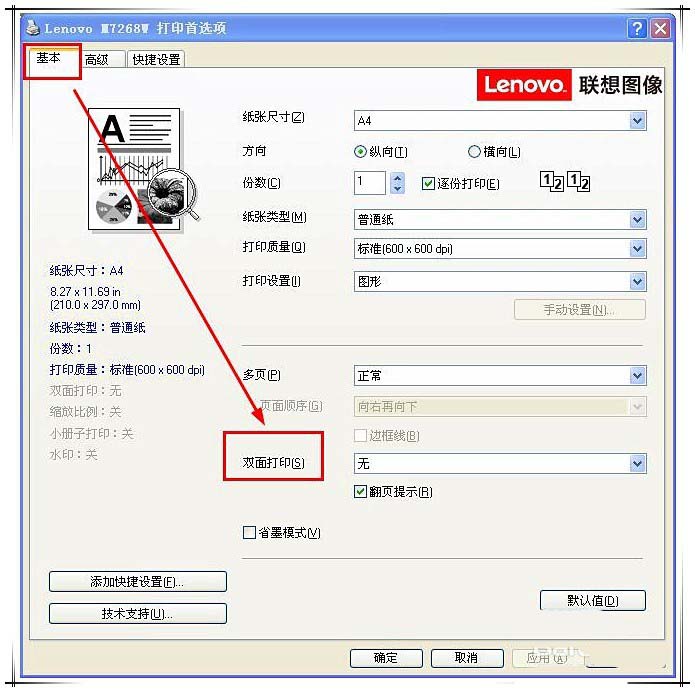4、在彈出的“Lenovo M7268W打印首選項”窗口中,切換到“基本”選項卡,在該選項卡,可以找到“雙面打印”選項。