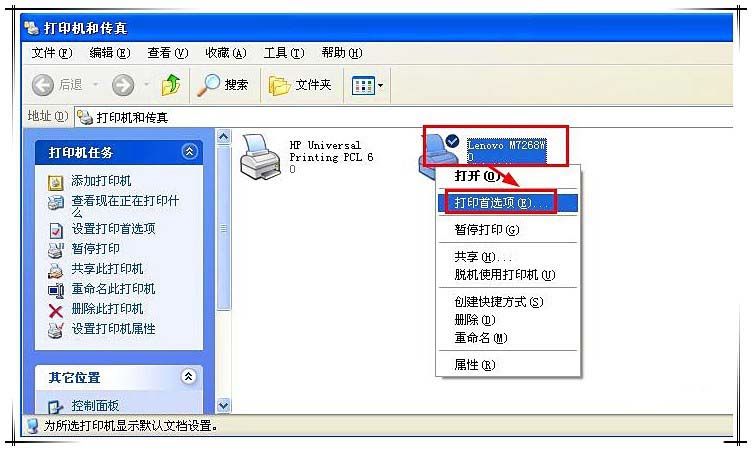 3、在打開的窗口中,找到“Lenovo M7268W”打印機,在該打印機圖標上右擊鼠標,然后在彈出菜單中選擇“打印首選項……”選項。