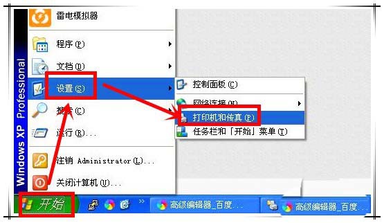 2、然后,在電腦上(以XP系統為例),依次點擊菜單“開始”——“設置”——“打印機和傳真”,打開電腦上安裝打印機的列表窗口。