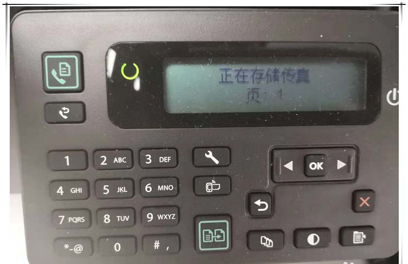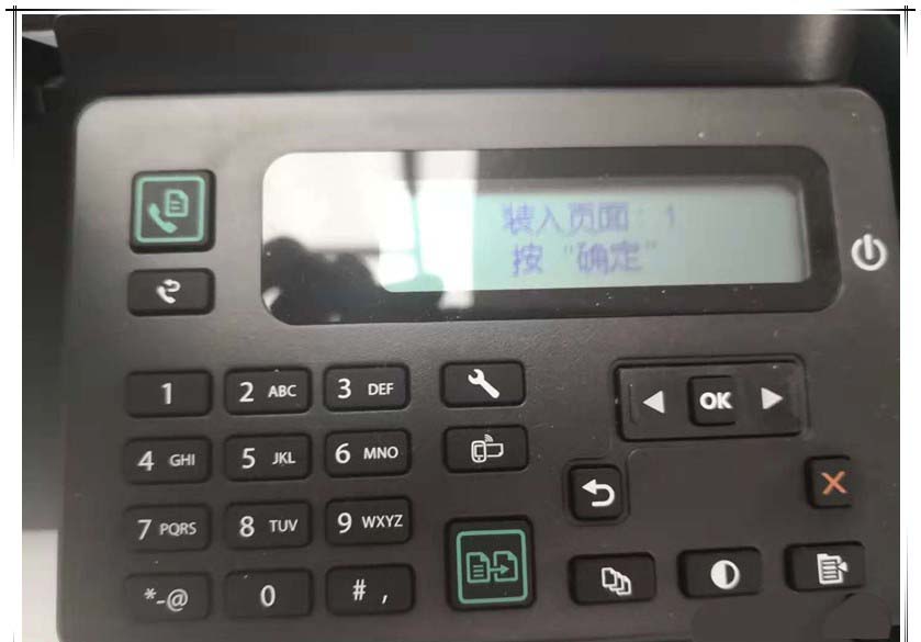 6、然后按照顯示屏提示在頂端紙槽中裝入要傳的紙,繼續按“OK”鍵確定,傳真機開始掃描存儲第一張紙。