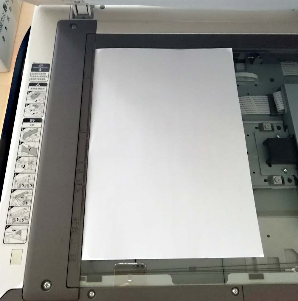 1、開機,將文件資料原件有字的那面朝下,縱向放入打印機內部,合上頂蓋。