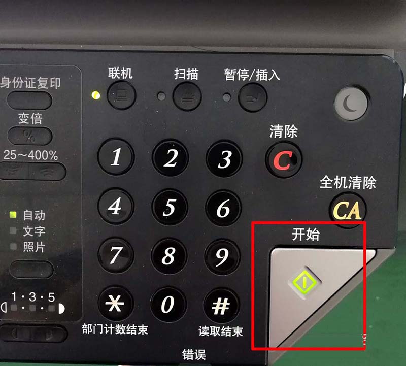 3、根據數字鍵盤,輸入需要復印的份數,這里以20份為例,輸入好復印份數之后,按下“開始”鍵,機器就會進行復印操作了。