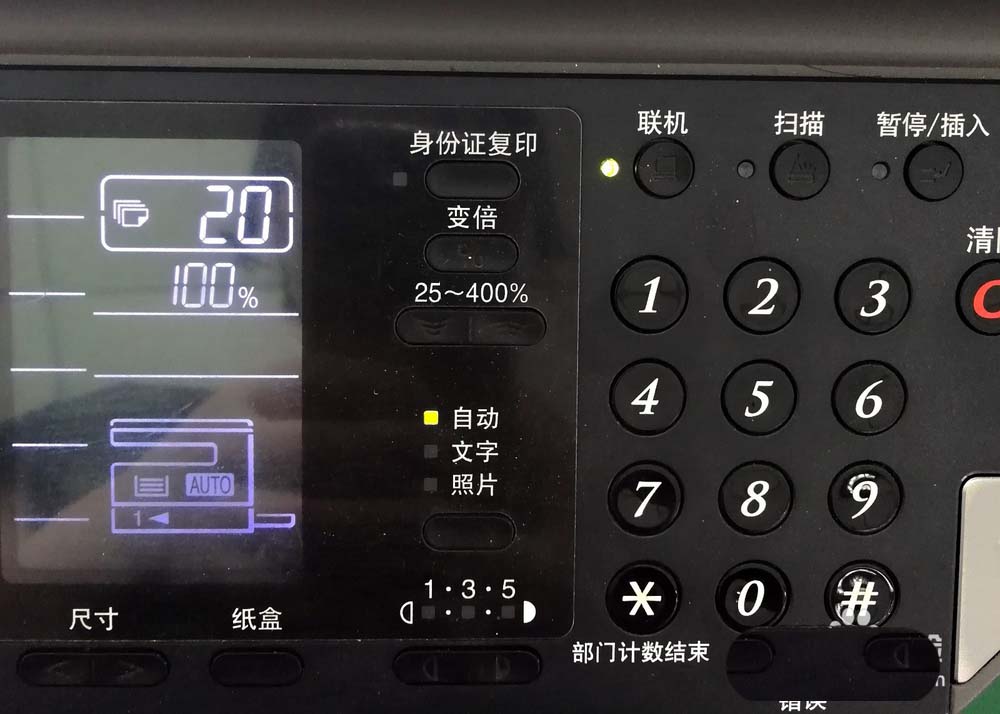 5、復印完成后,主面板的份數顯示值會恢復到之前設定的“20”,為了避免別人誤碰到“開始”鍵重復復印操作,可以將份數清零,按下“清除”鍵即可。