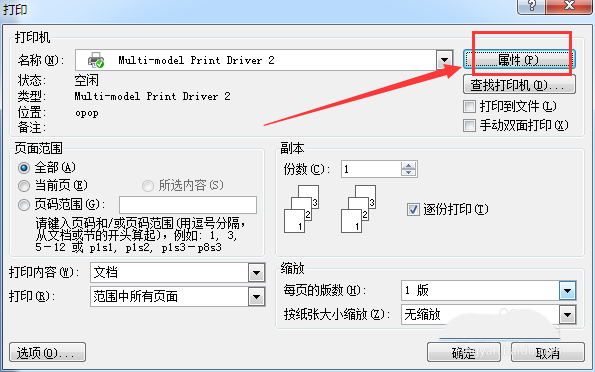 3、彈出打印對話框后我們點擊打印機右側的“屬性”,進入打印機屬性頁面后我們看到現在默認的是“單面打印”,那么下面我們去設置默認雙面打印