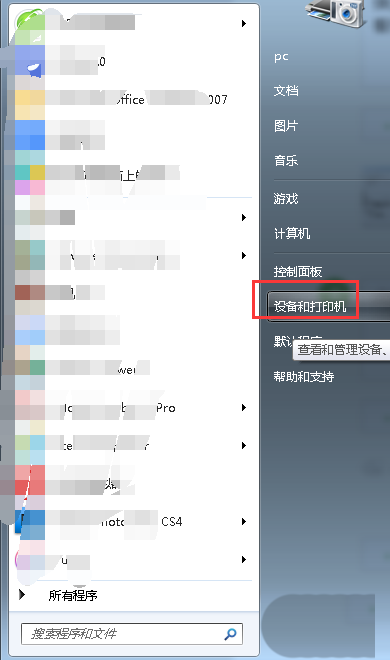 4、點開屏幕左下角的開始圖標并在彈出的對話框中選擇“設備和打印機”并打開