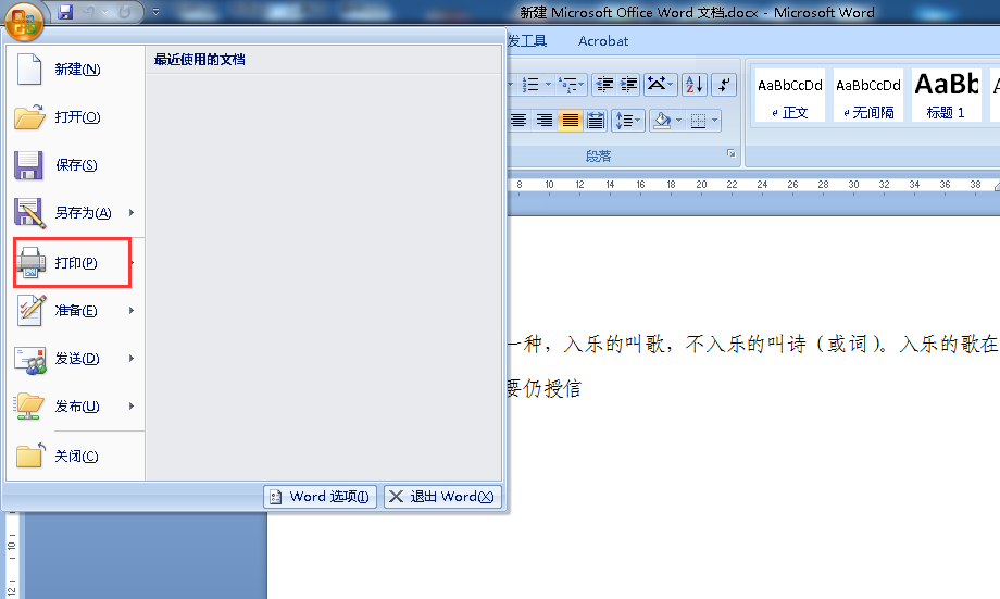 2、打開word文檔后點擊上方的office按鈕并點擊選項下的“打印”