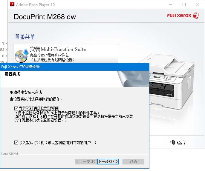7、設置安裝完成,可以勾選“在開機時啟動狀態監視器”和“設為默認打印機”,點擊下一步。