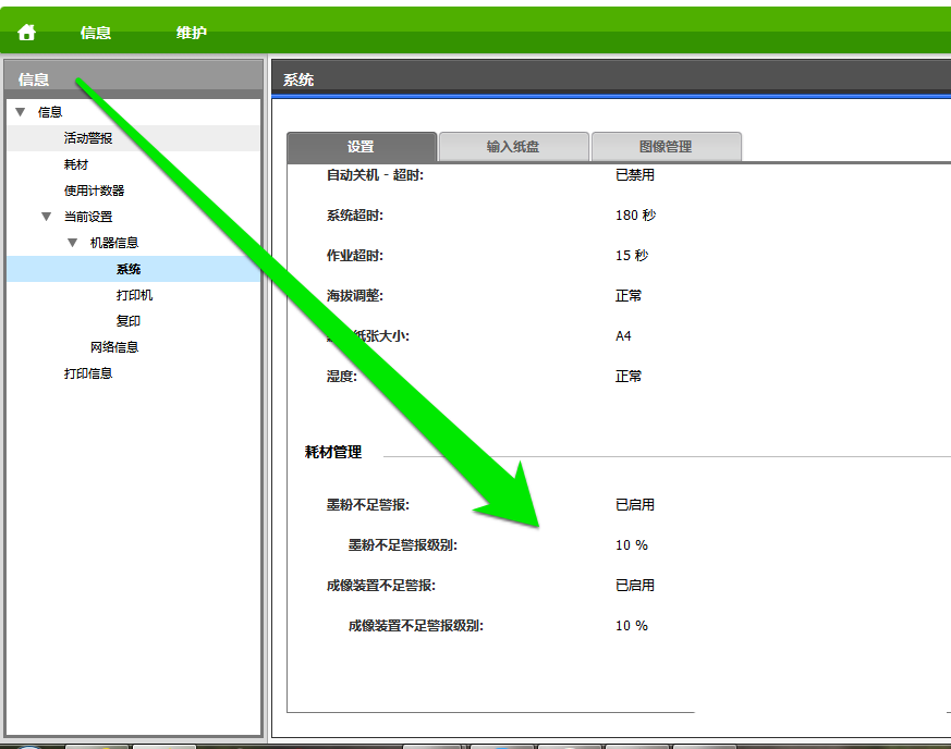 5、為了方便告知打印機使用的用戶,一般打印機管理員會設置碳粉、墨盒常用的耗材的用量警告。