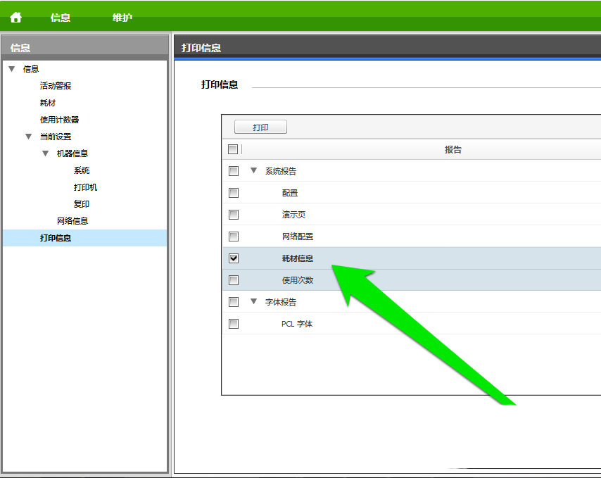 6、為了便于打印機耗材的存檔,我們選擇耗材打印按鈕。
