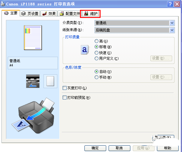 4、進入打印機首選項后,點擊右上角的維護選項。