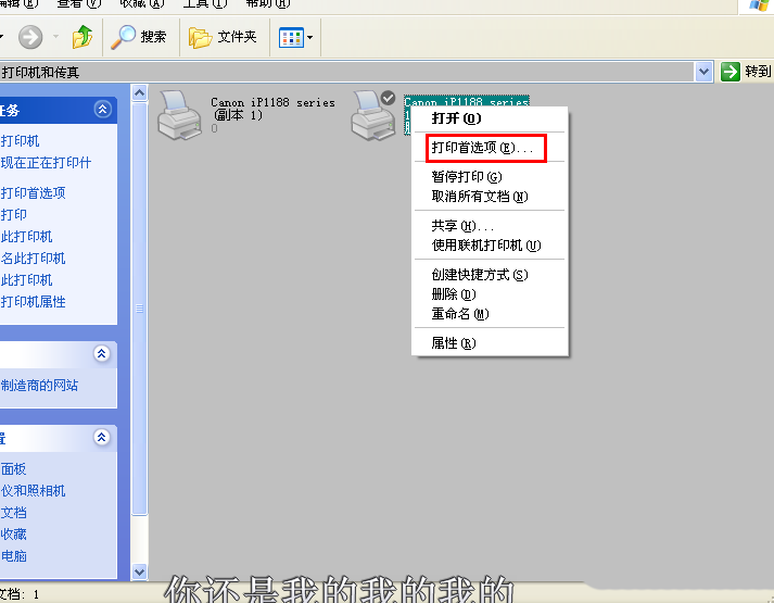 3、進入打印機和傳真界面后,找到自己的設備并右鍵點擊打印首選項。