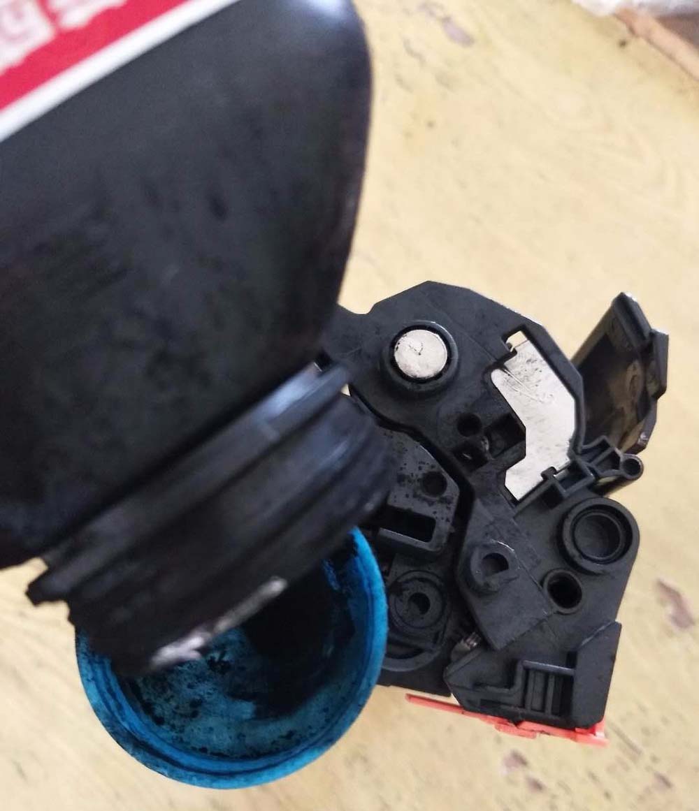 4、將碳粉盒”加粉口“朝上豎立,把加粉漏斗放好。