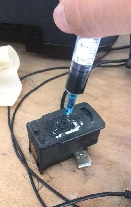 4、然后, 以此按照對應顏色抽取墨水加入墨盒中。注意分鐘墨水分別用不同的注射器,不能混用。注射器淺淺插入墨盒的海綿中,緩慢注入墨水使海綿完全吸收,不易多加,否則會漏墨。