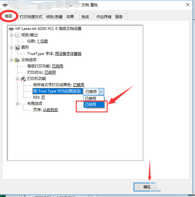 2、彈出打印機屬性窗口后,點擊【高級】-【將True Type作為位圖發送】選擇已啟用,點確定保存然后就可以打印超大號字體了