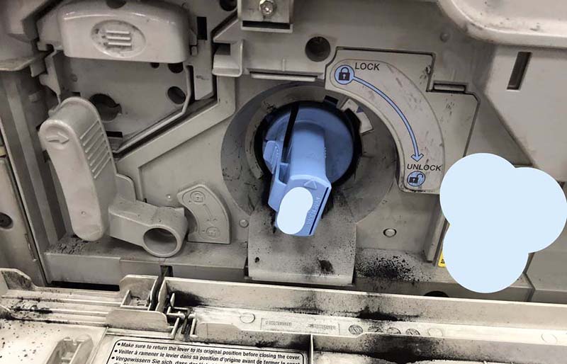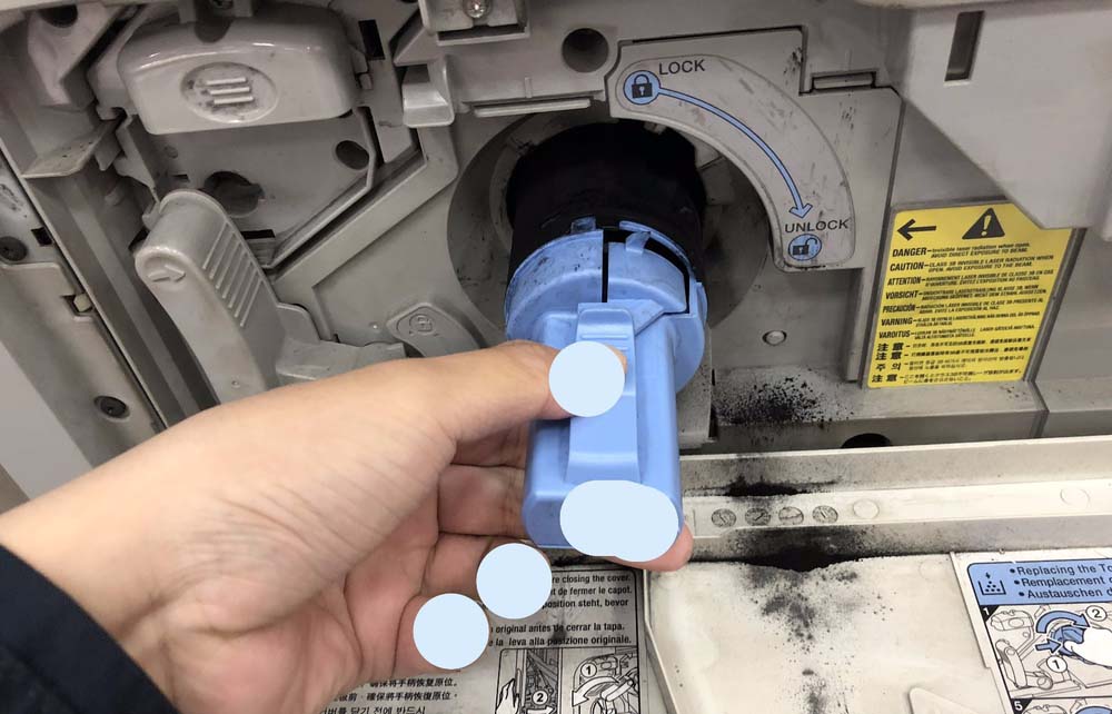 3、捏住墨盒淺藍(lán)的按鈕,然后順時(shí)針旋轉(zhuǎn)到解鎖位置,然后將墨盒抽出。注意防止墨粉灑出。