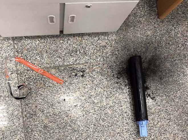 2、我們將序號(hào)一的擋板取下,直接用手掰開(kāi)即可。圖中墨粉泄露比較嚴(yán)重了,需要用吸塵器清理。