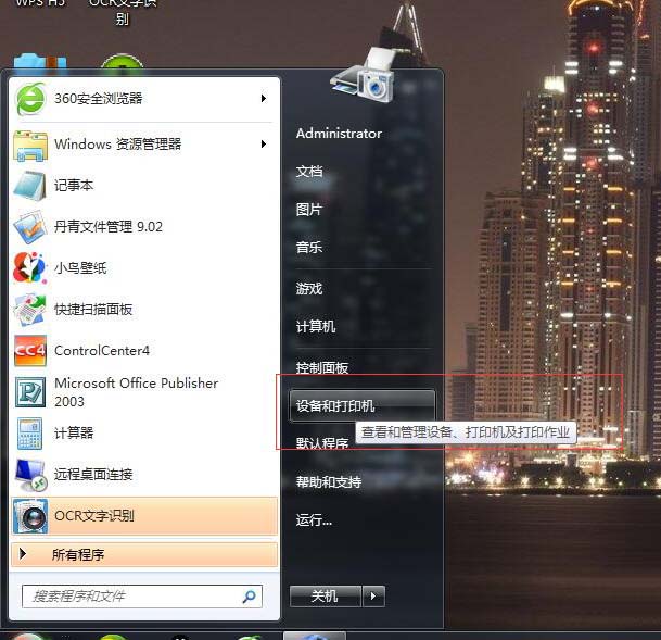 3、其實(shí),我們可以為其指定,一個(gè)默認(rèn)的掃描程序,我指定的是第一個(gè),其具體的設(shè)置方法如下。首先,點(diǎn)擊電腦的開(kāi)始菜單,從右側(cè)中找到設(shè)備與打印機(jī),并點(diǎn)擊。