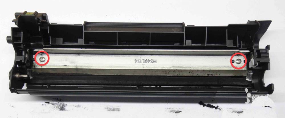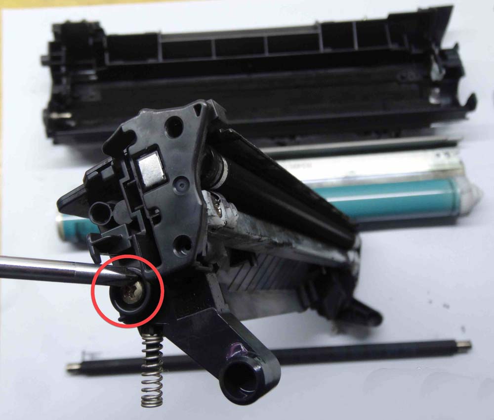 1、將硒鼓有齒輪的一側豎起,將紅圈指示的螺絲擰開。