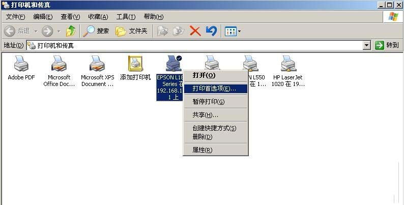 2、選中要清選的打印機,鼠標右鍵“打印首選項”