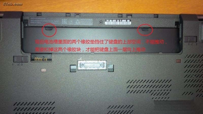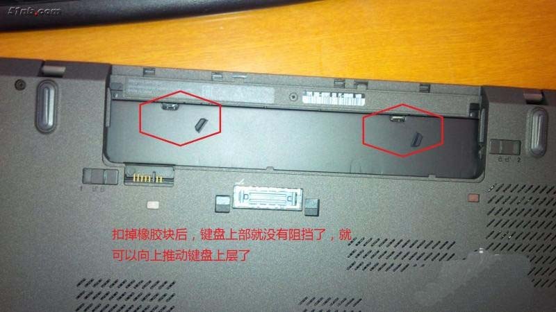 今天我們就來看看聯想T440筆記本更換鍵盤的方法,固定T440鍵盤的4/6個螺釘都在鍵盤的上面,需要移動鍵盤上面一層才能看到螺釘,不需要松D殼的螺釘就可以拆下鍵盤向上推動鍵盤上面一層前,需要扣掉背后電池槽里的兩個橡膠塊,有這兩個橡膠塊的阻擋,鍵盤上面一層不能上向推動。