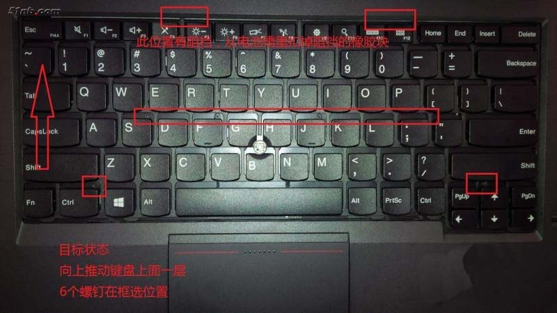 2、鍵盤框架向上輕輕一推就可以看到固定鍵盤的螺絲,向上推鍵盤框架之前要把背面固定鍵盤的卡扣取下,電池覆蓋位置。這款鍵盤有4個螺絲柱和6個螺絲柱。拆的方式都一樣。