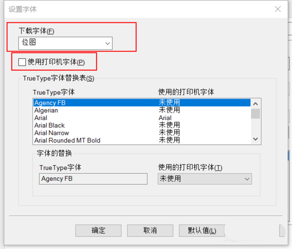 6、下載字體里選擇位圖,使用打印機字體前面的勾取消,一直確定到設備打印機,這樣就不會亂碼了,第二步重復操作為的是給他改成默認這個設置