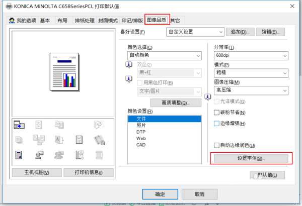 3、點高級------打印機默認值----圖像品質-----右下角點設置字體