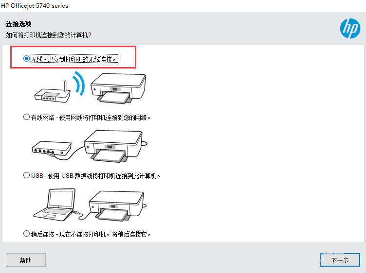 7、軟件安裝完畢后,進(jìn)入連接選項(xiàng)界面。此處以最為普遍的無(wú)線(xiàn)連接為例。選擇無(wú)線(xiàn)連接,點(diǎn)擊進(jìn)入下一步。
