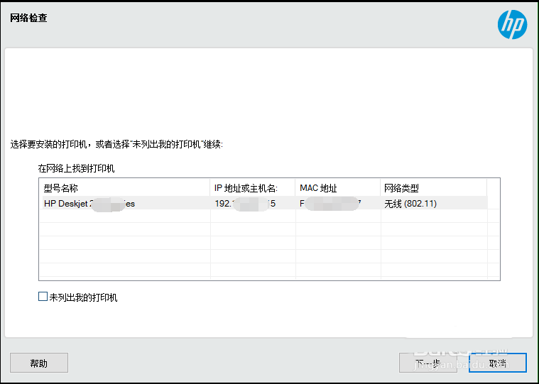 8、系統(tǒng)就開(kāi)始自動(dòng)進(jìn)行網(wǎng)絡(luò)檢查。如果您的打印機(jī)已經(jīng)聯(lián)網(wǎng),將會(huì)檢查出該打印機(jī)的聯(lián)網(wǎng)信息。如打印機(jī)的型號(hào)和IP地址等。