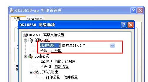 4、新增紙張后,需要對打印機添加這個紙張類型,打印機上點右鍵-屬性-打印首選項-高級,紙張規格設置為剛剛新建的快遞單,保存