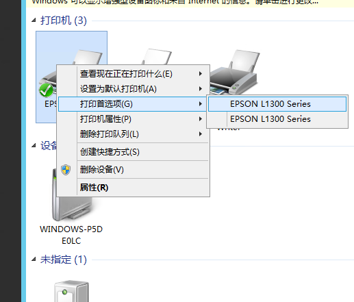 3、在打印機選項上右鍵,選擇“打印機首選項”,進入打印機首選項對話框。
