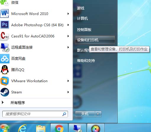 2、點擊桌面最小角“開始”菜單,選擇“設備與打印機”,進入控制版面。